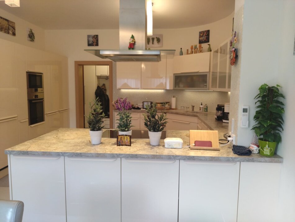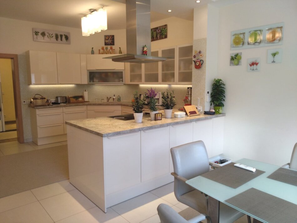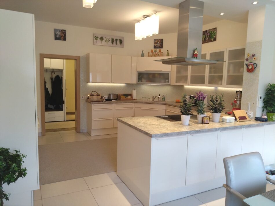 Im Erdgeschoß befindet sich außerdem noch ein Schlafzimmer mit en-suite Bad, ein geräumigis Büro, eine Wohnküche mit separatem Wirtschaftsraum, sowie ein Gäste-WC. Die Raumhöhe beträgt 2,8 m.