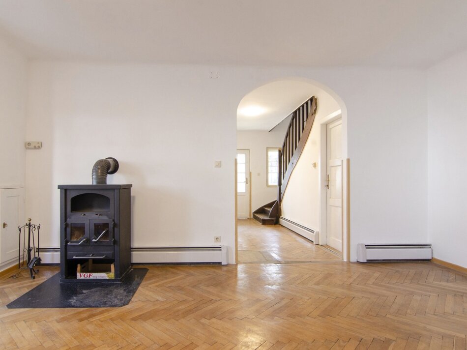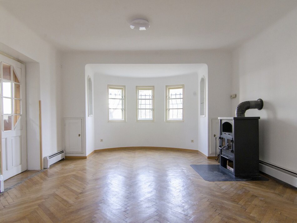 Das Hochparterre bietet ein Vorzimmer, ein wunderschönes Wohnzimmer mit Erker und Ofen, ein Zimmer mit direktem Ausgang zum Garten, eine separate Küche und ein WC.