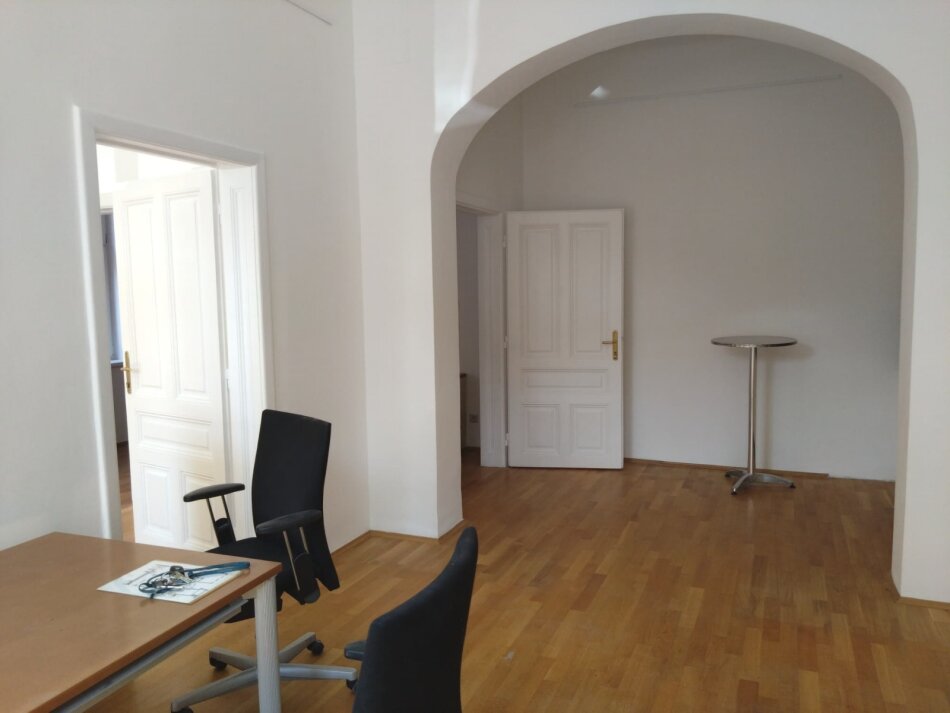 Das Erdgeschoß hat eine Größe von rd. 80 m² und besteht aus 3 einzelnen Zimmern, weiters einem großen Vorraum, einem WC, weiters einem kleinen Abstellraum, in dem sich auch die Installationstechnik befindet. In einem der gößeren Zimmer ist seitlich eine Büroküche mit Herd, Kühlschrank, etc. eingerichtet.