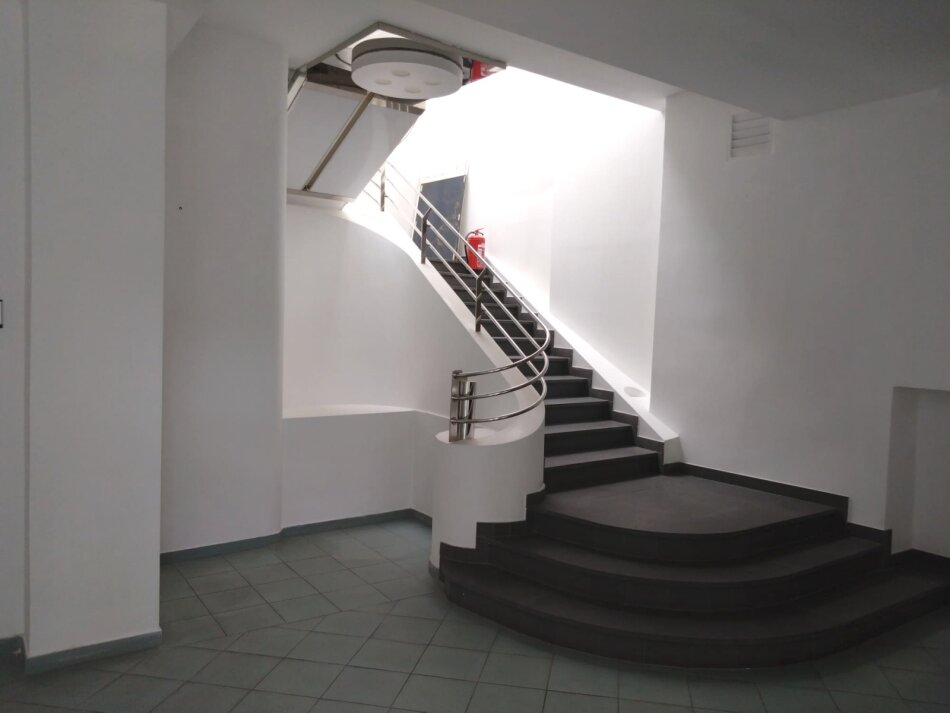 Eine frontale Stiege führt zu einem Obergeschoß, welches verschlossen und nicht zugänglich ist, die Stiege ist daher nur als Abstellfläche oder für Pflanzenschmuck geeignet.