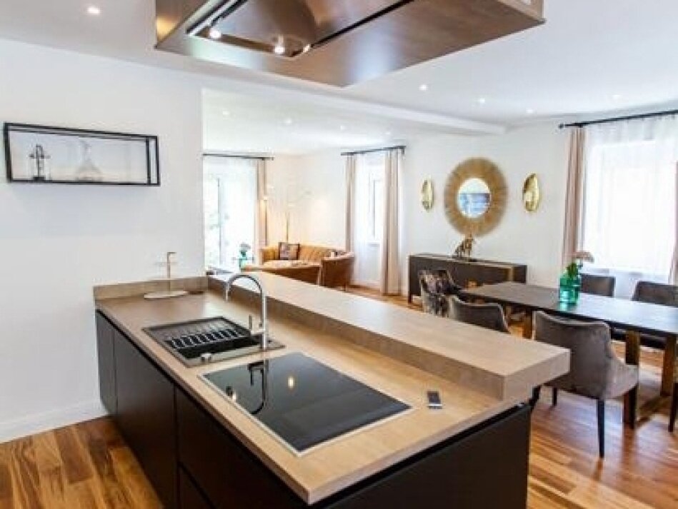 Der weitläufige Wohn-Essbereich mit offener Designküche beeindruckt mit stilvoller Möblierung und erstklassiger Ausstattung. Großflächige Fenster durchfluten die Räume mit Licht und schaffen ein behagliches Ambiente.