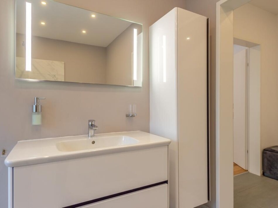 Vier voll ausgestattete Schlafzimmer bieten Rückzugsorte für Familie und Gäste – jedes davon hochwertig möbliert. Ergänzt wird das Raumangebot auf dieser Ebene durch elegante Bäder von Villeroy & Boch, sowie durchdachte Nebenräume wie ein Abstellraum und eine eigene Waschküche.