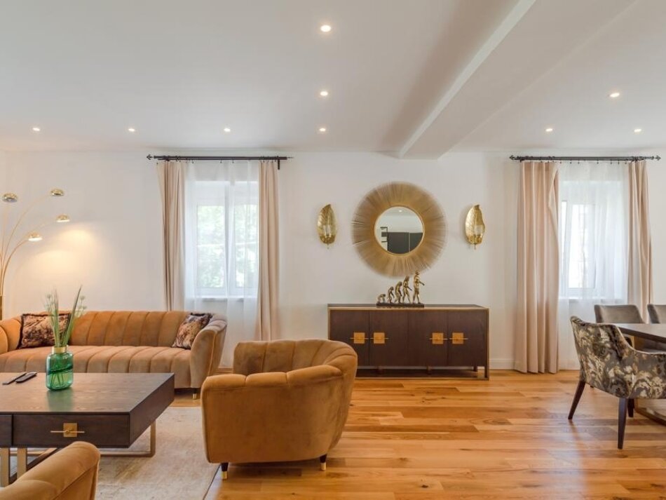 The spacious living-dining area with an open design kitchen impresses with stylish furnishings and first-class equipment. Large windows flood the rooms with light, creating a cozy atmosphere.