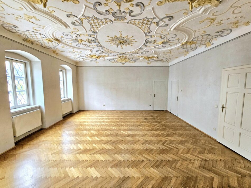 * Historischer Charme: Der Wohnsalon besticht durch eine original Barocke Stuckdecke, die dem Raum eine elegante und zeitlose Atmosphäre verleiht.