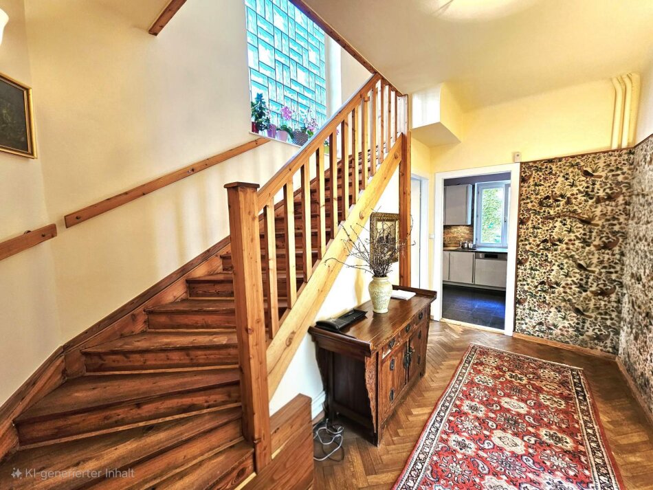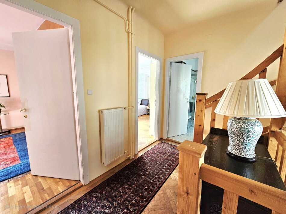 Im Erdgeschoss betreten Sie einen einladenden zentralen Vorraum, der Sie in die hellen und hohen Räume des Hauses führt. Hier erwarten Sie zwei großzügige Zimmer, die viel Platz für individuelle Gestaltungsmöglichkeiten bieten. Die großen Fenster sorgen für eine angenehme Lichtdurchflutung und einen direkten Zugang zur Terrasse, die zum idyllischen Garten führt – ideal für entspannte Stunden im Freien. Die separate Küche ist funktional und bietet ausreichend Platz für kulinarische Abenteuer. Hochwertige Parkettböden verleihen dem Erdgeschoss eine warme und einladende Atmosphäre. Abgerundet wird diese Etage durch eine praktische Garderobe und eine separate Toilette.
