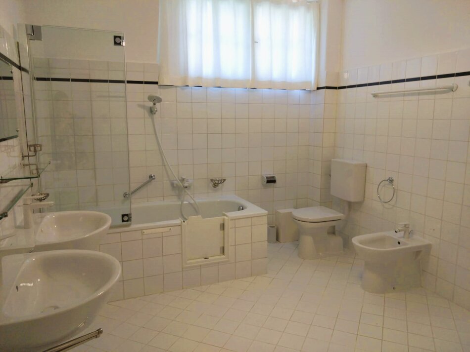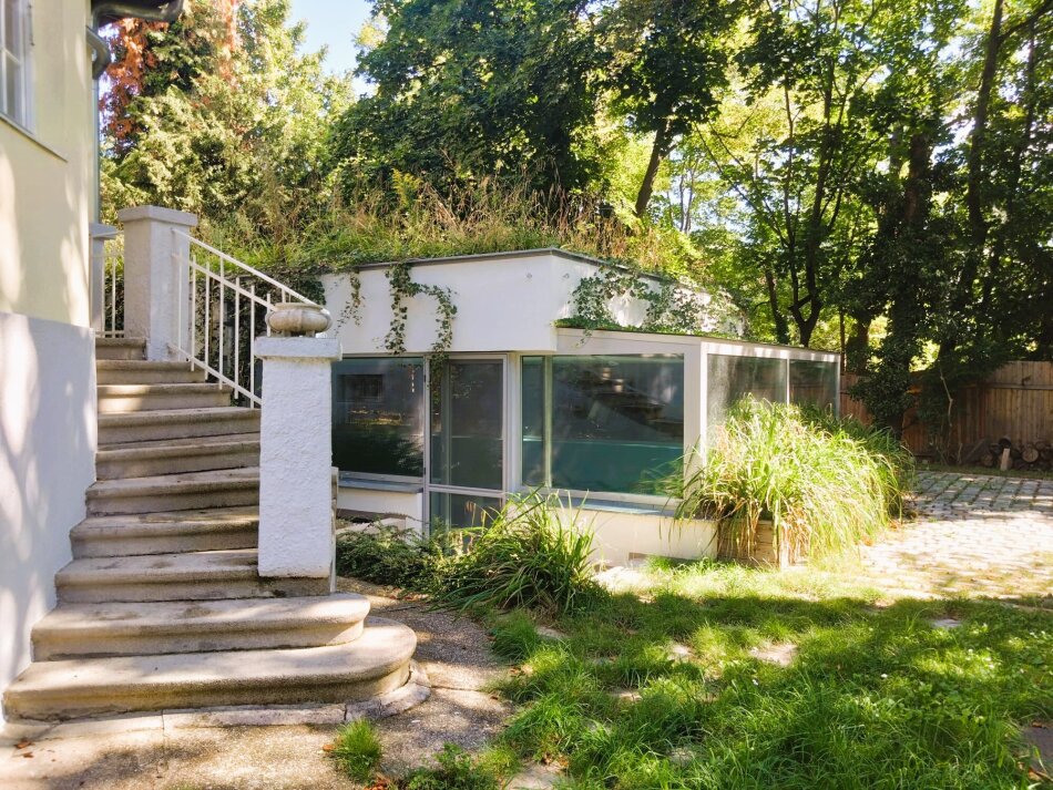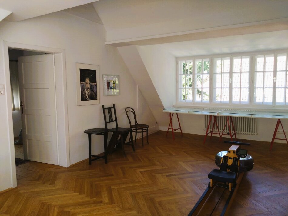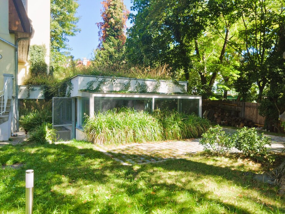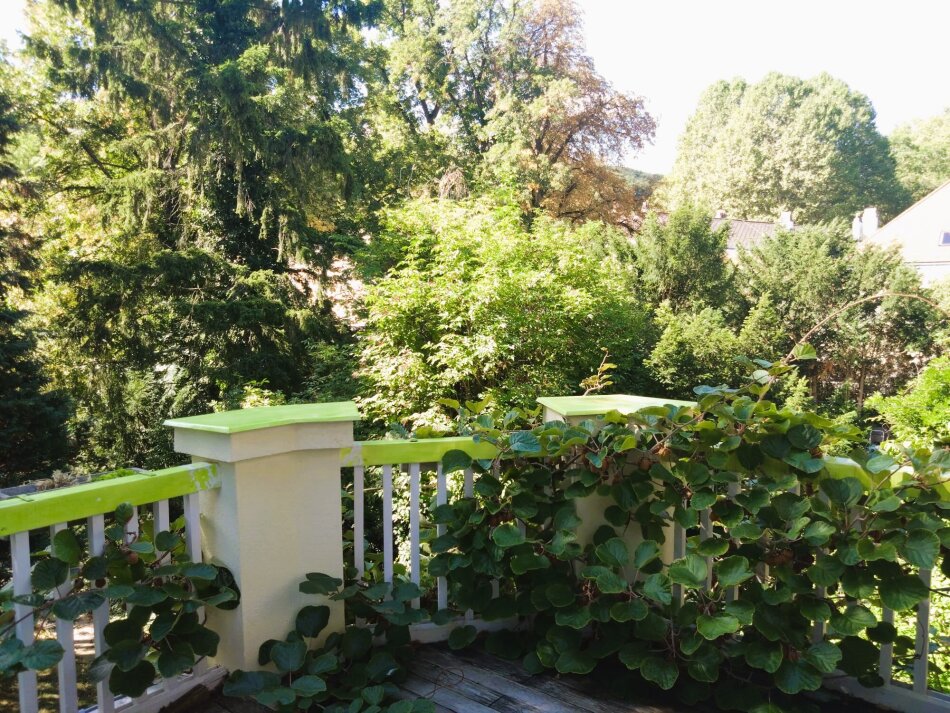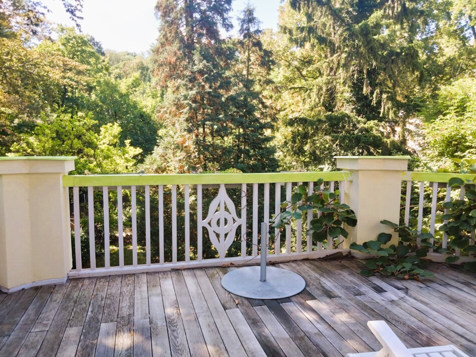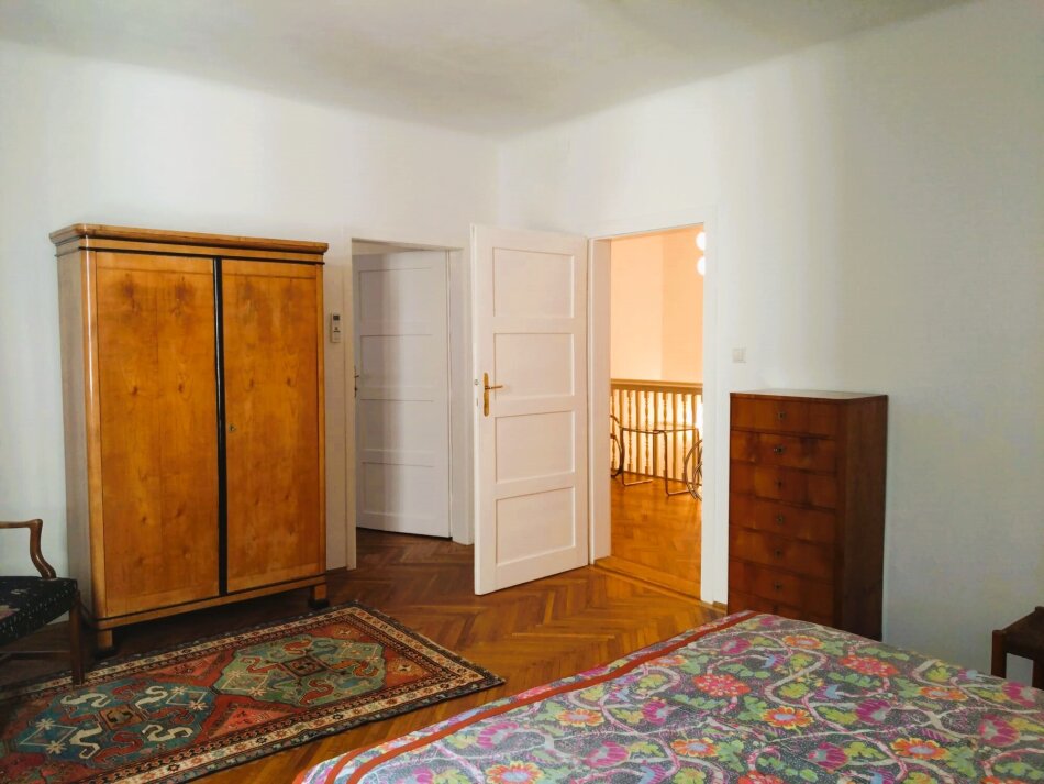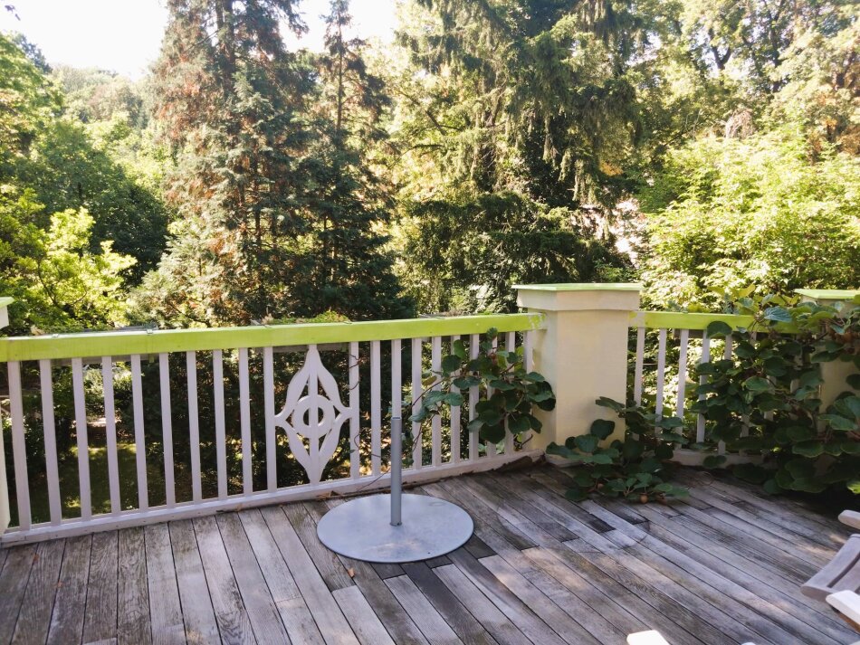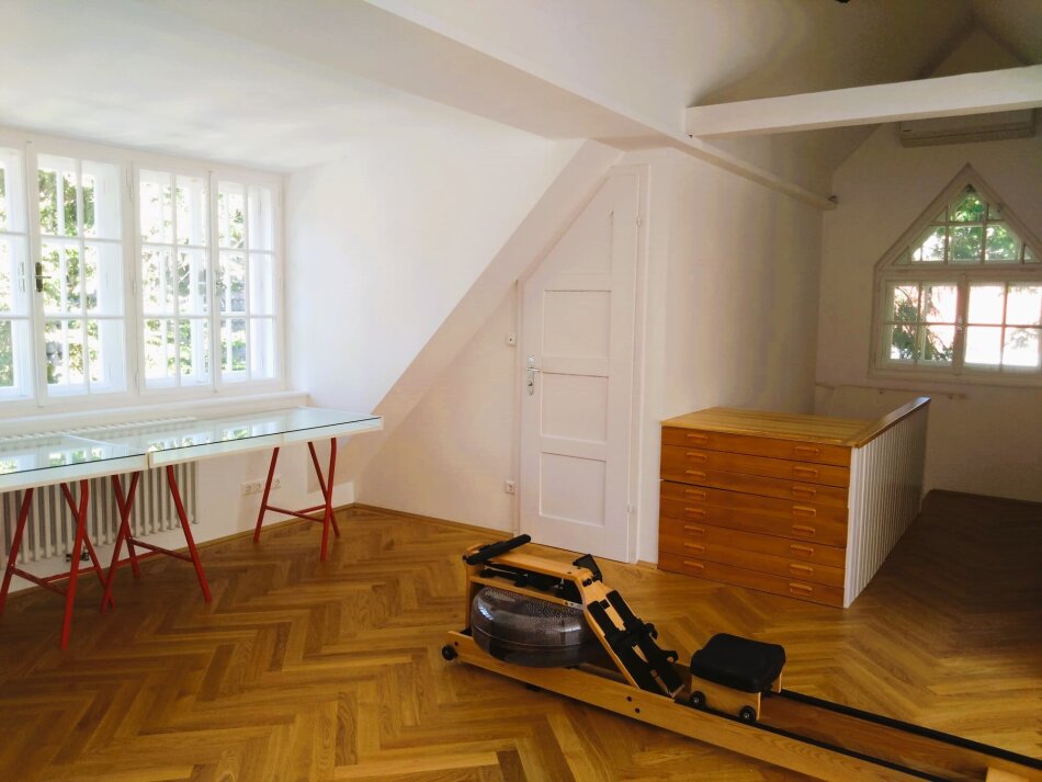 Im 1. Obergeschoss sind zwei herrschaftliche Zimmer (eines davon mit gartenseitiger Südterrasse mit traumhaften Blick auf den Pötzleinsdorfer Schlosspark), ein Kabinett und ein weiträumiges Bad mit Fenstern.
