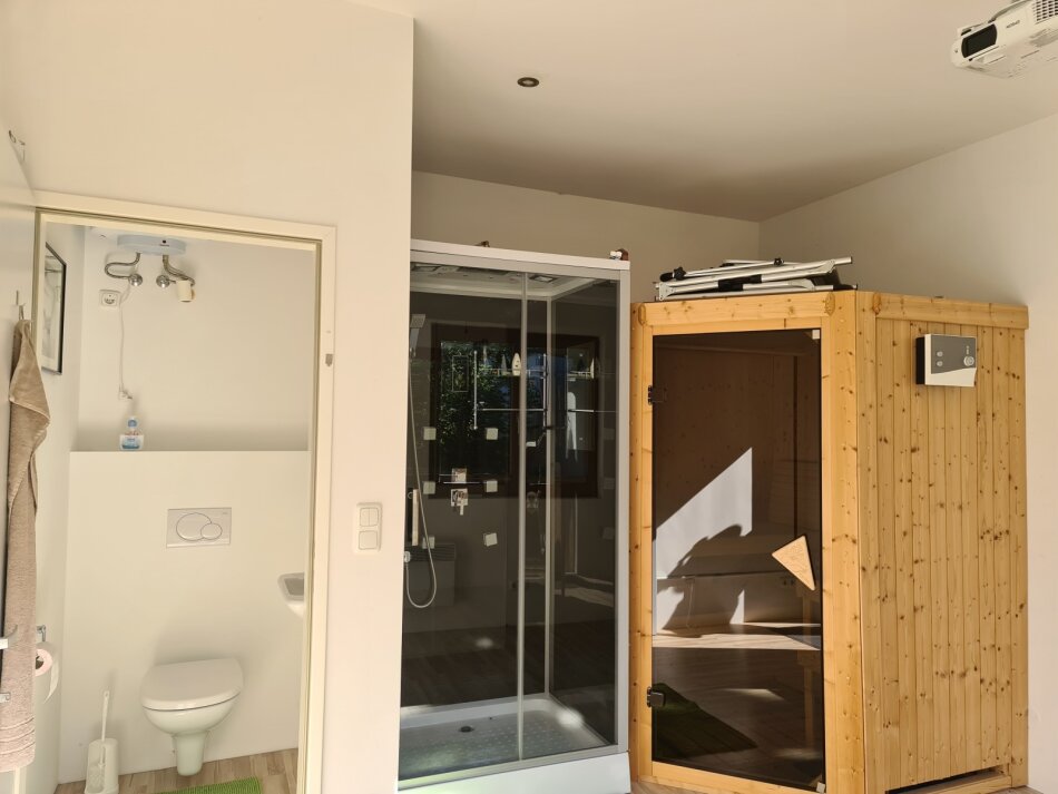 Die durchdachte Raumaufteilung umfasst zwei moderne Bäder, die Ihnen sowohl eine Badewanne als auch eine Dusche und Sauna bieten – ideal für entspannte Wellness-Momente nach einem langen Tag. Zudem stehen Ihnen zwei separate WCs zur Verfügung, was den Wohnkomfort für Familie und Gäste erhöht.